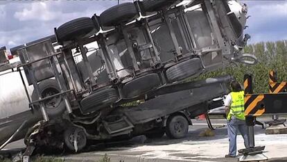 En el siniestro de hoy, que se ha producido a las 11.30 horas en el kilómetro 76 de la carretera N-240, en el acceso al polígono industrial de Juneda, se han visto implicados tres vehículos: una furgoneta, un camión cisterna que transportaba poliuretano y una camioneta. Las primeras investigaciones apuntan a que la furgoneta no ha realizado la parada obligatoria en un stop y ha sido arrollada por el camión, que a su vez ha volcado y ha aplastado a la camioneta. Han fallecido los dos ocupantes de la furgoneta y el conductor del camión ligero.