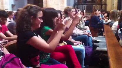 Sin embargo, al principio de la sesión de animación a la lectura, Laura Gallego parecía no saber dónde meterse, qué hacer con las manos, qué expresión adoptar, cuando los estudiantes de seis institutos valencianos la recibieron con ovaciones y aplausos este miércoles al mediodía. Entró a la enorme iglesia del antiguo monasterio de Sant Miquel dels Reis de Valencia, sede de la Biblioteca Valenciana, y se acercó tímidamente a los chavales seguida de cerca de los fotógrafos y los cámaras. Y del secretario autonómico de Cultura, Rafael Ripoll, quien no quería despegarse de ella.