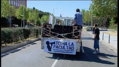 Un portavoz policial ha confirmado la detención de dos participantes en las protestas del campus de Somosaguas, por impedir la circulación de un vehículo que transportaba a una mujer con discapacidad física. Desde el colectivo Toma la Facultad, vinculado al 15-M y que impulsa la movilización contra los recortes en el ámbito universitario, descargan de responsabilidad a los dos detenidos, que identifican como estudiantes de Ciencias Políticas: "No había ocurrido nada, han cargado y se los han llevado", señala un miembro. En este campus se habían instalado hoy barricadas, pero ya han sido retiradas, y la Facultad de Ciencias Políticas está prácticamente vacía.