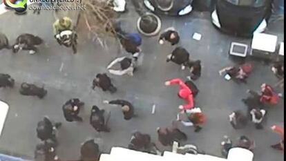 Minuto 2.50. Desde arriba se ve cómo Luis Alonso Zari, en la acera junto a la fachada del vecino que tomó el vídeo, ya está en el suelo inmovilizado. Jordi Anthony Pennock, con el pelo rubio increpa a los agentes para que suelten a Zari, al que no conoce de nada. No se acerca, por lo tanto no intenta evitar la detención. Instantes después, un policía antidisturbios, según el atestado un inspector jefe al mando de la unidad, se lía a porrazos con el joven y lo detienen entre varios agentes.