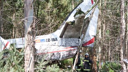 En los árboles, algunos destrozados por el paso de la avioneta segundos antes de estrellarse, ya a muy poca altura, y otros cortados por los bomberos para acceder con más facilidad al lugar del siniestro, quedaron restos del fuselaje del aparato desprendido durante la caída.