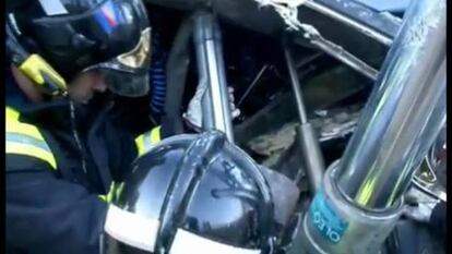 Los bomberos explican en un texto previo al vídeo que recibieron "varias llamadas" avisando del choque. Tres dotaciones acudieron a las cocheras, que aparecen en las imágenes. "Las condiciones de trabajo fueron muy penosas ya que hubo que transportar el material de rescate (separadores, cizallas, cilindros ram, motores, tablones, radial...) a mano a una distancia de 150 metros", explican en el blog, que resalta que la operación se hizo "en pendiente y en un terreno muy poco coherente".