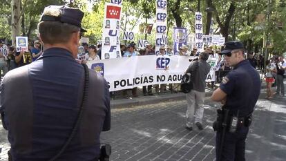 Alrededor de un centenar de policías se han concentrado esta mañana frente a la sede del Ministerio del Interior, en el número 5 del paseo de la Castellana. Convocados por tres sindicatos del cuerpo (CEP, UFP y SP), los manifestantes protestaban por los recortes que ha sufrido el cuerpo y que les afecta de manera especial en su jornada laboral y en sus nóminas. El representante de la Unión Federal de la Policía en Madrid, Antonio Sánchez Esturillo, ha criticado las medidas del Gobierno de Mariano Rajoy y ha explicado el desánimo que existe dentro del cuerpo, lo que se ha traducido en una reducción de la actividad policial, en especial en el número de identificados y detenidos.