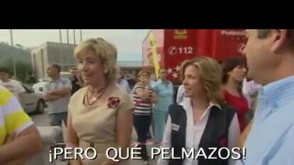 Aguirre llevó a preguntar por su presencia a un grupo de periodistas de Telemadrid. "¿Quién les ha dicho a ustedes que vengan? Ya hay otra cámara de Telemadrid", observó al equipo recién llegado de la televisión pública madrileña. "A ver, ¿qué les han dicho a ustedes?", insistió Aguirre. "No, nosotros veníamos a grabar el daño medioambiental", casi se llega a justificar la reportera.