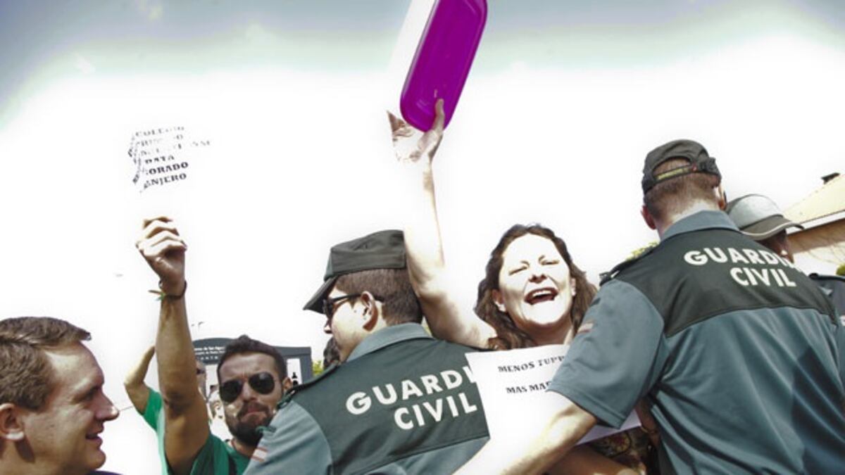 A las puertas del centro, el grupo de manifestantes ha aumentado a la docena —10 de ellos con la camiseta verde— y ha coreado los lemas contra el tuppery los nativos así como "dimisión dimisión" y "presidenta, escúchanos". Frente a ellos, un grupo de otros tantos partidarios de Aguirre, entre ellos varias abuelas, la han aplaudido y han gritado "presidenta, presidenta" a Aguirre y "ya está bien" a los opositores". En pleno rifirrafe, la presidenta ha salido del centro y se ha dirigido a pie hacia su coche. Cuando todavía no había alcanzado el vehículo, la mujer, muy nerviosa y exaltada, le ha lanzado una tartera sin nada dentro. La fiambrera ha caído a unos metros de la presidenta. La mujer, en paro, ha asegurado que le ha tirado el tupper a Aguirre "para ver si lo cogía". "Pretenden que paguemos los libros. Nos han quitado la beca de comedor, nos exigen uniforme, qué pretenden?", ha señalado a los medios.