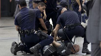 Los arrestados son dos hombres miembros de UGT y una mujer, de CGT, que pasadas las 13.00 han quedado en libertad con cargos. Según la Delegación del Gobierno, el piquete informativo, compuesto por unas 200 personas, ha intentado traspasar un cordón policial. Los sindicatos, por su parte, se quejan de la actuación policial y aseguran que solo estaban manifestándose con megafonía. "Había seis policías por cada manifestante", sostiene Marta Robledo, responsable de prensa de UGT y presente en Atocha. En la zona de acceso a los andenes de Renfe Cercanías y media distancia permanecen una docena de antidisturbios.