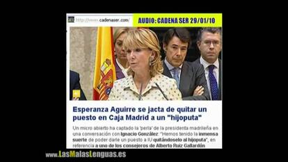 Alberto Ruiz-Gallardón ha sido el objeto de muchas de los deslices de la lideresa. Y el más sonoro aconteció en 2010, en plena batalla por el control de Caja Madrid tras la elección de Rodrigo Rato como su presidente. Aguirre apartó a un representante puesto por Gallardón y los micrófonos grabaron el momento en que comenta la jugada con su vicepresidente, Ignacio González: “Yo creo que hemos tenido una inmensa suerte de poder darle un puesto a IU quitándoselo al hijoputa”. Aguirre intentó aclarar que el "hijoputa" al que se refería no era Alberto Ruiz-Gallardón, como creyeron casi todos, sino a un ex consejero de Caja Madrid llamado Fernando Serrano. El objetivo final de sus invectivas, pese a estas aclaraciones, seguía siendo el mismo, pues el hombre de confianza de Ruiz-Gallardón en la comisión de Control de Caja Madrid era justamente Fernando Serrano. Aguirre decidió quitar al representante del alcalde en ese órgano para darle a Ruben Cruz (IU) su puesto, uno de los dos que le correspondían por votos al PP.