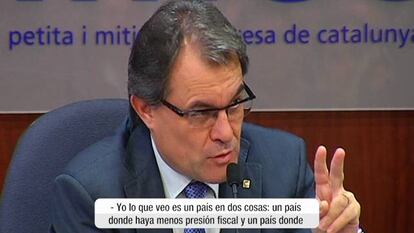 El miedo a la inestabilidad, al cierre de mercados y a eventuales boicots explican sus reticencias. Y a combatir todo ello se dedica estos días Artur Mas. Obviando que hace dos años también prometía no subir impuestos y los ha acabado subiendo, Mas insistió ayer en que una Cataluña fuera de España podría reducir la presión fiscal. Además, presentó al Gobierno central como un lastre para la actividad económica catalana. De ahí que insistiera en que con el Estado propio Cataluña “podría comenzar desde cero y crear una estructura jurídica mucho más ágil y moderna, sin tantas rémoras del pasado”. Preguntado por los empresarios, el presidente puntualizó que la bajada de impuestos no se prevé a corto plazo, sino cuando Cataluña se constituya en Estado independiente. “Cuando miro el Estado propio, veo un país con menos presión fiscal y más eficacia en la lucha contra el fraude”. Eso sí, dijo que en la actual situación no se “atreve” a bajar impuestos, si bien dio a entender que no se plantea reinstaurar el impuesto de sucesiones, como había insinuado su Gobierno en el pasado.
