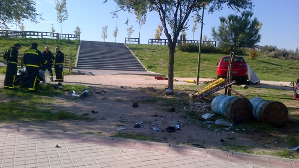Según el relato de Emergencias Madrid, a la altura del número 6 de la avenida Santuario de Valverde la moto, un scooter, se salió de la vía en una curva muy pronunciada a la izquierda, casi en ángulo recto, se metió unos 20 metros un parque, se estrelló contra unos bidones y sus ocupantes rodaron por el suelo. Pudo ser un despiste, pudieron perder el control de la moto o intentaron escapar de la mujer yendo por el parque.