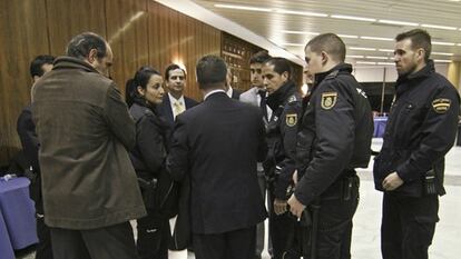 A esa hora se produjo un altercado que acabó con empujones, insultos y la intervención de la policía nacional. Todo se inició cuando acudieron al Palacio de Congresos dos personas de la candidatura de Gumpert e intentaron llevarse cuatro ordenadores personales. Algunos letrados empujaron a estas dos personas y les obligaron a que permanecieran en la sala hasta que llegara la policía.
