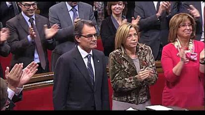 Artur Mas ha superado este viernes el debate de investidura que le permitirá mantenerse como presidente de la Generalitat de Cataluña. Lo ha hecho sumando los votos de los 50 diputados de Convergència i Unió y los 21 de Esquerra Republicana y después de comprometerse a convocar una consulta de autodeterminación de Cataluña esta legislatura. Al término de un debate de dos días de duración, y pese a sus demandas para ampliar la base política del acuerdo, Mas solo ha convencido a Esquerra Republicana. El Partit dels Socialistes, El Partido Popular, Iniciativa per Catalunya, Ciutadans y la Candidatura de Unidad Popular han votado en contra. En total, la investidura de Mas ha contado con 71 votos a favor y 63 en contra. Un diputado no ha votado.