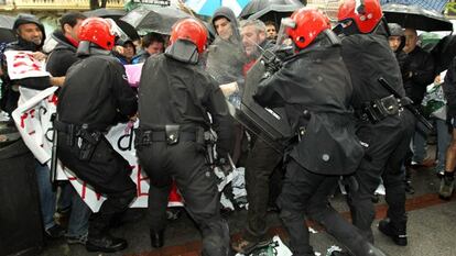 Incidentes entre Ertzaintza y colectivos sociales antes de la asamblea de BBK