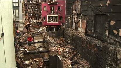 El desescombro ha sido la tarea principal desarrollada en la zona un día después del siniestro. Una grúa trabaja retirando los restos acumulados y derribando lo poco que queda en pie de alguno de los edificios quemados. Las tareas de evaluación de los edificios y limpiezas de las calles han comenzado en medio de los sentimientos de tristeza e impotencia de los afectados. La alcaldesa, Idurre Bideguren, ha defendido que la vuelta a la normalidad pasa por conseguir que el casco viejo "vuelva a ser lo que era" y ha pronosticado que "costará un tiempo".