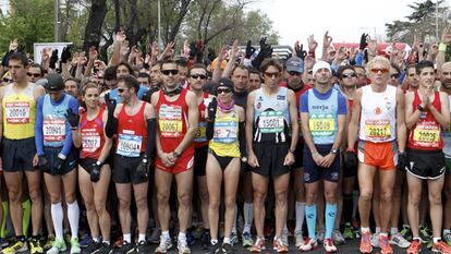 Con cuatro grados de temperatura y una sensación térmica todavía más fría, 26.000 corredores partieron de la plaza de Colón a las nueve de la mañana. La mitad, con el objetivo de acabar los 42.195 metros; el resto, después de recorrer con todos los tres primeros kilómetros, para cubrir el recorrido de sus respectivas carreras, los 10.000 metros o el medio maratón.