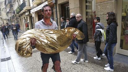 El artista granadino Omar Jerez recorre las calles de la Parte Vieja de San Sebastián con un cadáver en brazos simulando haber sufrido un atentado terrorista