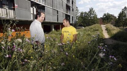 La realidad, en cambio, es bien distinta. La urbanización está abierta al público y la tecnología del portal dista mucho de parecerse a la que figura en los papeles. La zona infantil es un pequeño solar de cemento de obra sin pulir “donde si se cae un niño, se desolla”, y el citado jardín, por cuyo mantenimiento aseguran estos vecinos que pagan cerca de 6.000 euros al año, se reduce a un puñado de hierbajos coronado por un montículo de arena que recubre los escombros de las obras del garaje. “Lo supimos cuando empezamos a tener goteras abajo por el riego”, explica Abel. Dentro de las viviendas, hay grietas y desconchones, pero ni rastro de las persianas. En su lugar hay unos paneles de chapa a juego con el suelo de la terraza: un andamio de hierro forjado con rejillas. “Imagínate si andas descalzo por aquí”, sugieren.