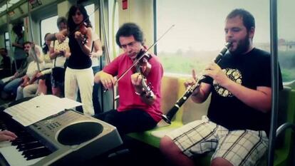 Los participantes -que muestran camisetas alusivas al siniestro y con imágenes de algunas de las personas que perdieron la vida en el accidente- están acompañadas por el resto de viajeros y músicos. Un grupo interpreta El Cant dels Ocells a dos violines, clarinete y piano.