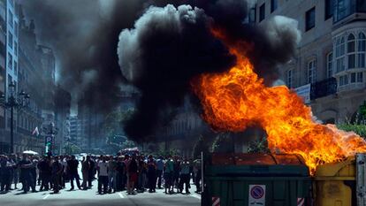 El portavoz de CC.OO., Ramón Sarmiento, ha señalado a Europa Press que el expediente del tax lease se ha convertido en un "problema de Estado", y ha insistido en que la construcción naval es, junto con la automoción, uno de los "motores" de la economía de la comarca, por lo que Vigo "se juega mucho". "Que nos escuche Europa", ha pedido, al tiempo que ha exigido a Almunia "que borre su sonrisa de la cara cuando habla del naval, porque es un asunto muy serio". El portavoz de UGT, Diego Atanes, también ha insistido en pedir la implicación de toda la ciudad en la manifestación de la próxima semana, y de sectores como el comercio o la hostelería, que también "viven gracias a los sueldos de los trabajadores del naval". Las protestas de este jueves han ido más allá de los gritos y las consignas, y un grupo de trabajadores ha quemado dos contenedores frente a la sede de la Agencia Europea de Pesca. También se han lanzado botellas de pintura contra la fachada del edificio, en pleno centro de la ciudad, aunque los incidentes no han ido más allá.