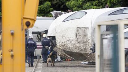 Uniformados con monos blancos de plástico, guantes, botas y casco de protección, los agentes del GOIT emplearon sierras radiales e incluso una especie de azada para abrirse paso entre las chapas metálicas del tren. Dos perros adiestrados de la unidad canina se fueron alternando en la búsqueda de fragmentos humanos, según fuentes de la investigación, entre los vagones deshechos. Recogieron efectos personales de los pasajeros y otros elementos que tendrán que procesar. Solo la parte delantera del tren, que pilotaba Garzón, conserva más o menos intacta su estructura exterior con el cristal frontal de la cabina del conductor completamente estallado.