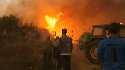 La madrugada del domingo fue un infierno en los montes de Cualedro y Monterrei. El fuerte viento dificultó los trabajos de los equipos de extinción, intensificó las llamas y agravó la amenaza de que surgieran nuevos focos. La alerta 1, peligro para personas y casas, se mantuvo activada por el Gobierno gallego durante un día hasta cerca de las 20 horas de ayer. Los vecinos de este municipio defendieron durante todo el fin de semana sus viviendas con lo que pudieron: desde aperos de labranza a tractores propios. Cuando la luz del día lo permitió, diez hidroaviones y ocho helicópteros repitieron viajes de ida y vuelta a los ríos cercanos para descargar sobre el fuego. Por tierra, dos técnicos, cinco agentes forestais, 17 brigadas, ocho motobombas y cinco palas excavadoras.