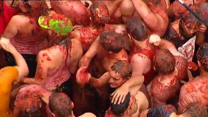 La Tomatina 2013 ha sido revolucionaria hasta en la meteorología. Pasaban las 9.00, pero parecía que ya estaba anocheciendo. Amenazaba tormenta. Algo inédito. Lo demás siguió el guion previsto: el agua tirada de mangueras y pozales desde las ventanas, ropa manchada de vino, un enorme pene erecto de gomaespuma apuntando hacia la pancarta de Stop Homofobia colgada por el Ayuntamiento... Y la gente enloquecida. Eso sí, la marea humana era menor que la de otros años. La limitación del aforo a 20.000 personas y la obligatoriedad de pagar han traído cambios más importantes que los simples números.
