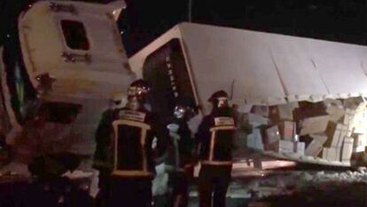 Según Emergencias-112 el conductor, un hombre de 34 años, ha sufrido un traumatismo craneoencefálico moderado, y su acompañante, de 30, diversas contusiones. Ambos han sido trasladados al hospital de Getafe. La Guardia Civil investiga las circunstancias del accidente en el que solo se ha visto implicado el tráiler.