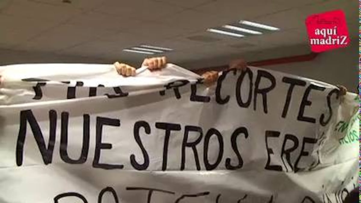 "Tus recortes, nuestros ERE's. Botella dimisión", coreaban los empleados mientras alzaban el cártel y acusaban de "mentirosos" a los miembros del equipo de Gobierno. Algunos de los trabajadores despedidos gritaban que no tenían derecho a indemnización ya que sus contratos son subrogados. El presidente del Pleno, Ángel Garrido, Garrido ha ordenado su desalojo tras haberles conminado a cesar sus consignas para poder seguir en la comisión.