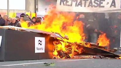 La protesta ha comenzado en la Alameda, a la que los trabajadores llegaron en una veintena de autobuses, y se ha dirigido al Pazo do Hórreo, en donde se celebra un pleno. Los manifestantes portaron un ataúd de cartón con el nombre de Navantia para representar la situación de la empresa y siluetas con las caras de los ministros Soria y Montoro, la del presidente el Gobierno, Mariano Rajoy, y la de Feijóo. Una vez ante el Parlamento prendieron fuego al féretro y a las figuras, que ardieron entre gritos de protesta de los operarios, que llevaban pancartas con lemas como 'Remátase o traballo, remátase a paciencia' o 'Carga de traballo para Navantia, xa. Polo futuro da comarca' y lanzaron varios petardos. La protesta estuvo vigilada por un amplio dispositivo de agentes antidisturbios, que vallaron la zona.