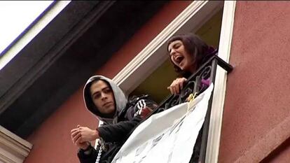 Encadenados al balcón de una pensión sita en la principal arteria del centro vitoriano, la calle Paz, y exhibiendo una pancarta en la que se leía "Aski da [basta ya]. Ni una más". los dos jóvenes han sido detenidos ante cientos de personas y con un fuerte dispositivo de la Ertzaintza, que ha enviado una decena de furgones y más de una treintena de agentes al arresto. El cordón policial ha evitado que los manifestantes se acercaran a ellos.