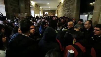 Un grupo de jóvenes ha boicoteado las charlas - coloquio que el exmagistrado de la Audiencia Nacional, Baltasar Garzón, pretendía ofrecer en las facultades de Ciencias de la Educación y en la Historia de la Universidad de Santiago. Con gritos de 'fascista' y 'torturador', cerca de veinte jóvenes han interrumpido en varias ocasiones a Garzón, quien invitó a los que le insultaban a subir a la mesa para exponer sus argumentos pero solo uno aceptó participar. En el aula completamente abarrotada, hubo momentos de tensión entre los alumnos que querían escuchar al exjuez y los que con un micro no cesaban de dedicarle insultos culpándole de presuntas torturas sufridas por presos etarras que el exmagistrado ordenó detener.