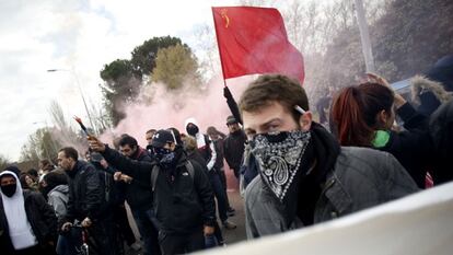 Los estudiantes han empezado en la avenida de la Complutense y han entrado en las facultades de Matemáticas, Físicas y Derecho para informar de lo que estaban haciendo. En esta última, han dejado dos bengalas encendidas y un bote de humo rojo. La manifestación, que ha empezado esta mañana con unos 150 estudiantes, ha llegado a tener unos 600. Un grupo de unas 100 personas ha intentando sin éxito avanzar hacia el rectorado.