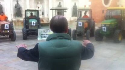 Los vehículos agrícolas llegan con retraso. “Nos ha costado entrar en la ciudad”, apunta Miguel García, que toca la tuba en la banda. “Hombre, no es lo que estamos acostumbrados”, opina sobre la obra que ha ensayado. “Es una aventura, una nueva experiencia”, interviene Elpidio López, clarinetista, desde su tractor, aparcado frente a una tienda de lujo, de las que pueblan el entorno de la plaza del Patriarca.