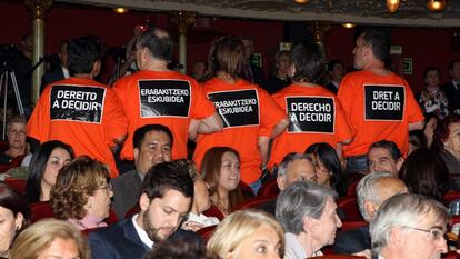 Ante los gritos de estas personas, desde la megafonía del teatro se les ha instado a abandonar el acto, mientras eran silbados por parte de los asistentes, que optaron por aplaudir para que no se pudieran escuchar sus lemas. Finalmente, las cinco personas, en cuyas camisetas también se podía leer "derecho a decidir", han abandonado el teatro y se ha dado inicio al acto.