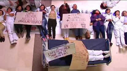“Los sindicatos aceptaron el cierre de camas a cambio de las vacaciones en verano para los trabajadores”. Con el personal sanitario escenificando una vez más en los hospitales la protesta contra la supresión histórica de camas anunciada por la Xunta para este verano —prescinde de 1.200—, el portavoz del grupo parlamentario del PP en la comisión de Sanidade, Aurelio Núñez Centeno, responsabilizó ayer en la Cámara a los representantes de los trabajadores de esa decisión política. Núñez utilizó este argumento para salir al paso de las duras acusaciones realizadas por BNG —que presentó una moción instando al Gobierno gallego a dar marcha atrás en este recorte—, AGE y PSdeG, que coincidieron en valorar la decisión del Ejecutivo autónomo, “con las elevadísimas listas de espera que hay”, como el intento de la Xunta por derivar a los pacientes a los hospitales privados. La oposición descartó la existencia de criterios técnicos y lo atribuyó a “una pura elección ideológica para degradar la sanidad pública”. Personal sanitario volvió a manifestarse ayer contra esta medida tendiéndose en el suelo en los vestíbulos de algunos de los principales hospitales públicos de Galicia.