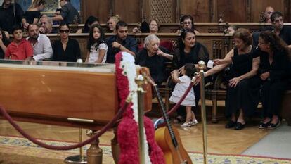 El presidente de la Generalitat, Artur Mas, y el consejero de Cultura, Ferran Mascarell, fueron las primeras autoridades en pasar por el Saló de Cent. La familia más directa de Peret permanece en la sala, donde a medida que pasa el tiempo se van acumulando las coronas florales. Al pie del féretro de Peret, dos guitarras: la del rey de la rumba y otra hecha de flores.