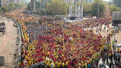 El proceso soberanista catalán recibió este jueves un importante impulso con la masiva manifestación que ocupó 11 kilómetros de las principales arterias de Barcelona en defensa de la consulta del 9 de noviembre y de la independencia. La Asamblea Nacional Catalana (ANC) y Òmnium Cultural, las entidades que han actuado como avanzadilla del plan soberanista, congregaron a cientos de miles de personas en las calles de la capital catalana con un mensaje doble. Al Gobierno le advirtieron de que la consulta es imparable, mientras que al presidente catalán, Artur Mas, le exigieron que no se arrugue y mantenga la unidad de los soberanistas. “El 9 de noviembre votaremos y ganaremos la independencia”, concluyó la presidenta de la ANC, Carme Forcadell, tras un mensaje muy claro a Mas: “Presidente, ponga las urnas”.