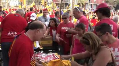 El equipo de EL PAÍS ha recorrido cámara en mano en busca de opiniones a pie de calle la multitudinaria manifestación en forma de V que ha ocupado esta tarde la ciudad de Barcelona. Ciudadanos de distintas edades han expresado su voluntad de manifestarse "de forma pacífica" para "defender los derechos del pueblo" catalán. Todos los entrevistados coinciden en subrayar la demanda principal de votar en una consulta sobre la independencia, aunque no se muestran seguros de que eso suceda debido a la actitud del Gobierno central: "Habrá que ver cómo reaccionan los políticos españoles", afirma un joven.