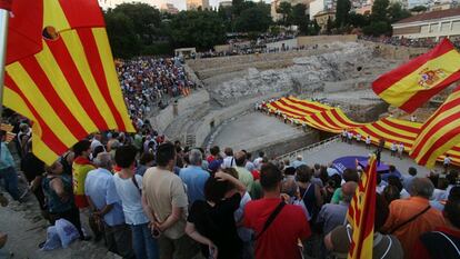 Los partidarios de la unidad de España celebraron ayer en Tarragona su primera Diada en contra de la secesión después de las tres ediciones multitudinarias que se han vivido hasta ahora. El acto, de carácter festivo y lúdico, reunió a simpatizantes del Partido Popular y Ciutadans y a militantes y cargos socialistas como la exdiputada Carme Chacón. Joaquim Coll, vicepresidente de Societat Civil Catalana, la entidad organizadora del acto, fue categórico en el discurso que pronunció desde la arena del anfiteatro romano. “Teníamos ganas de romper este silencio. No podíamos consentir que la única voz que se escuchara hoy fuera la que persigue el estropicio cultural, económico, cultural y sentimental”, exclamó en medio de aplausos.
