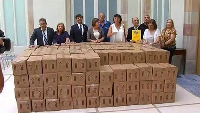 Las firmas se han trasladado en más de 200 cajas que un camión ha dejado ante las puertas del Parlament. Tras descargarlas, una delegación de miembros de la ANC liderados por su presidenta, Carme Forcadell, se han reunido con la presidenta de la Cámara catalana, Núria de Gispert.