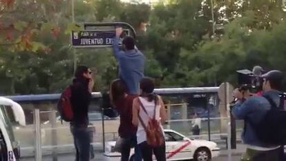 Un grupo de jóvenes coloca sobre el cartel de la glorieta una nueva leyenda