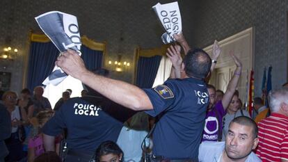 El momento más agrio lo mantuvo con el concejal de EU, Miguel Ángel Pavón. Este llegó a llamarla "!imputadísimia señora alcaldesa" y Castedo acabó apagándole el micrófono tras instarle a que finalizara. Simpatizantes de Podemos, Compromís y EU, incluidas las dos diputadas Mireia Mollà y Esther López, saltaron entonces al grito de "¡Castedo dimisión!". La sala, llena de asesores del PP y, según varias fuentes, de trabajadores de Ortiz, se convirtió en un revuelo de insultos y empujones que no fue a más tras la salida de quienes alzaron el grito de dimisión. "No sé si nos echan para protegernos o por armar ruido", dijo una mujer enfilando la puerta. Dentro quedaron los afines a Castedo. En las dos intervenciones siguientes, se escucharon insultos desde el público contra Pavón.