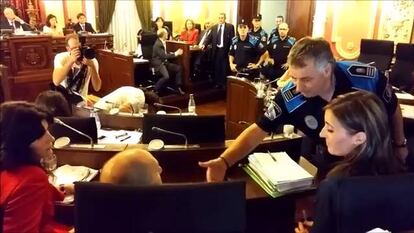 Una vez dentro y tras reclamar al concejal de DO que abandonase el escaño de forma “pacífica”, un agente solicitó al alcalde su autorización para el “uso de la fuerza mínima necesaria” a fin de proceder a la expulsión. El regidor autorizó el uso de la fuerza de viva voz y, tras otro breve enfrentamiento verbal, el concejal independiente abandonó el lugar escoltado por seis agentes. También dejaron la sesión la otra concejal que la formación tiene en la corporación y el asesor del grupo.