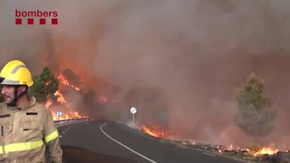 Por la mañana estaban trabajando en la extinción del incendio, el mayor de este año en Cataluña, 130 dotaciones terrestres de los bomberos y 11 medios aéreos: dos helicópteros bombarderos, cinco helicópteros bombarderos y cuatro aviones de vigilancia y ataque. Según han informado los Bomberos, el trabajo esta mañana se centra en el flanco izquierdo, en una zona paralela a la carretera C-37, entre los kilómetros 77 y 80, donde aún se ven llamas.