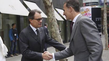 El Rey Felipe VI y el presidente de la Generalitat, Artur Mas, han coincidido este martes en Barcelona por primera vez después de las elecciones del pasado 27 de septiembre. Ambos se han saludado con un apretón de manos antes de inaugurarse el XVI Foro Iberoamérica, que se celebra con el título "La revolución digital".