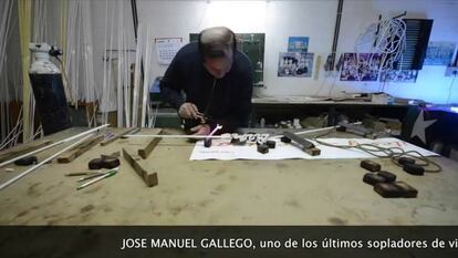 El cartelista de Tánger afincado en Vitoria, de padre madrileño y madre andaluza, recuerda a su progenitor soplando desde que tiene uso de razón en el taller de la ciudad marroquí. De Tánger se movieron a Tetuán y después de dos años a Ceuta, para acabar en un País Vasco que ya despuntaba como región industrial y emergente. En Marruecos rompió los primeros tubos de cristal en medio del enfado de su padre, que pacientemente le fue enseñando a soplar con tino. Le enseñó a manipular los tubos de cristal con aire y un soplete, a meter el gas, a pasar una bola de mercurio por el tubo para activarlo y que luzca con brillantes colores, y finalmente a moldear su paciencia para aguantar horas y horas concentrado moldeando vidrio. Después de toda una vida de artesano, ve como su sector da paso a otras tecnologías.