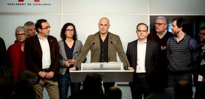 Junts pel Sí puso una escenografía de excepción para presentar su última oferta. Además de su cabeza de lista, Raül Romeva, comparecieron ante los periodistas una decena de representantes para transmitir la idea de unidad. No apareció en cambio, Artur Mas, a quien reservan para un eventual debate de investidura que podría celebrarse la semana que viene si la CUP acepta votarlo.
