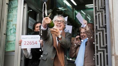 El primer premio del sorteo ha llegado también a Barcelona y al área metropolitana. La administración de lotería de la plaza de Urquinaona, situada en el corazón de la capital catalana ha sido uno de los puntos en los que se ha repartido la buena suerte. En ella esta mañana se podía ver a Pedro Fortuño, su propietario, y a su familia. Todos ellos salían felices de un coche mal aparcado, dispuestos a bañar con cava la entrada de la administración de lotería número 97. El responsable de local, su mujer y sus dos hijas habían estado sentados en el vehículo escuchando la radio con atención. “El año pasado dimos dos quintos del sorteo de Navidad, que salieron muy temprano. Me enteré de la noticia cuando había salido a comprar algo. Tuve que coger un taxi”, explica Fortuño. Así que este año la familia se arregló y se acercó al establecimiento por si acaso, para que El Niño no les pillara desprevenidos.
