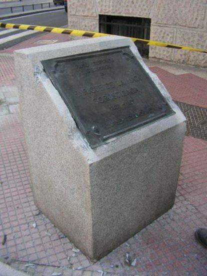 El Ayuntamiento admite que quitó el monumento a finales del mes pasado porque "estaba dañado". Concretamente, señala que se encontraba afectado el pedestal de granito que sostiene la placa de bronce con los datos del personaje. En cuanto lo reparen, insisten desde el Consistorio, lo volverán a instalar. De momento se han vuelto a colocar baldosas en el lugar donde se encontraba, por lo que es difícil hallar el lugar que ocupaba. Fuentes municipales sostienen que en los últimos tiempos se habían producido dos graves accidentes contra el hito y que, por eso, es necesario reubicar el elemento en el futuro. En las imágenes enviadas por el Ayuntamiento no se aprecian daños ni en el granito ni en la placa, pero sí unas muescas hechas para levantarla.