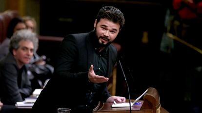 España descubrió este viernes a Gabriel Rufián; en Cataluña hace tan solo dos años que dejó de ser un ciudadano anónimo. El cabeza de lista de Esquerra Republicana (ERC) en el Congreso todavía era en 2014 un chico normal, padre de un niño de 5 años, que convivía con su pareja en Sabadell, donde dirigía la oficina de una empresa de recursos humanos. Su madre, Pepi Romero, explicó en un spot de la campaña electoral del 20-D que su hijo “siempre ha tenido sus ideas políticas, pero realmente cuando de alguna manera se comprometió, fue a partir de entrar en Súmate”. Súmate es una organización independentista próxima a ERC. La primera intervención pública de Rufián fue en una charla de Súmate en el Centro Cívico de Trinitat Vella (Barcelona), en febrero de 2014. Eduardo Reyes, su padrino en Súmate, le presentó como “un graduado social”, hijo de inmigrantes andaluces, de Santa Coloma de Gramenet, que quería explicar por qué se ha hecho independentista. El discurso de Rufián ha cambiado poco desde aquel día, y lo que ha cambiado, ha sido para adaptarlo mejor a su ultrasónica carrera política.