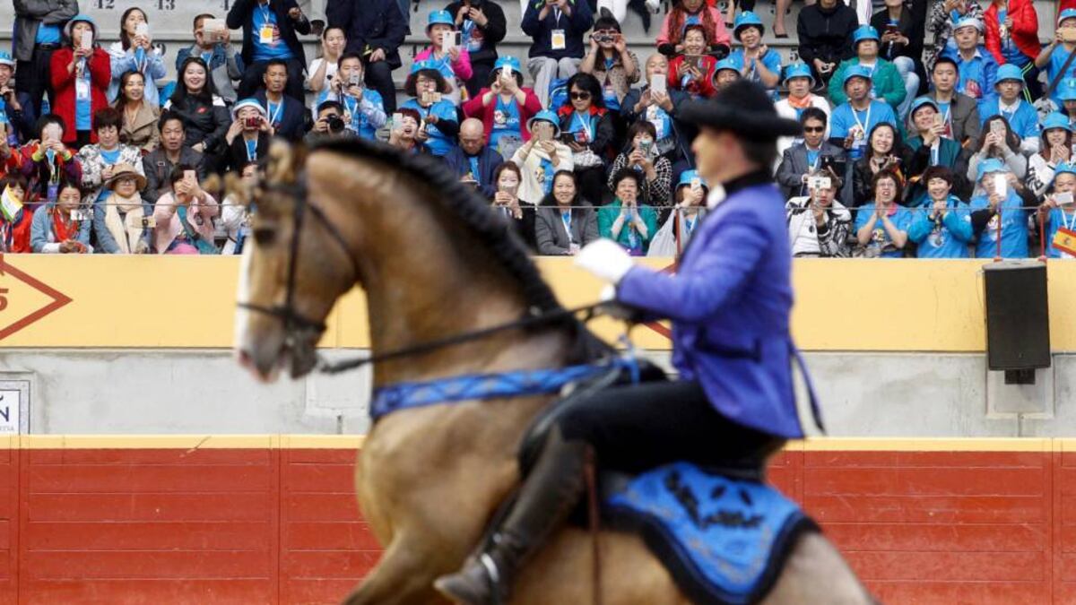 A continuación, llegó el turno de los caballos, sus bailes flamencos con jóvenes de trajes entallados y la parte más festiva de un espectáculo típico español para los que no conocen a fondo esta tierra. Verónica Ortega ha sido una de las bailaoras, lo es de forma profesional, y aunque ha actuado en otros certámenes similares, nunca lo había hecho antes 2.000 asiáticos: "Es increíble como animan, aunque empezaron muy fríos y aplaudan a destiempo. Son agradecidos, parece que les ha gustado", resume con cara de satisfacción, labios rojos, y un imponente vestido de gitana, de color blanco inmaculado. A su lado, Mamerto López, matador de toros y, desde hace cinco años, director de una empresa que organiza eventos taurinos. No dice el precio que ha costado el festejo, pero hace meses que lo tenían previsto. Pensaron en Moralzarzal porque el techo está cubierto y querían ser previsores por si llovía, como ha sucedido.
